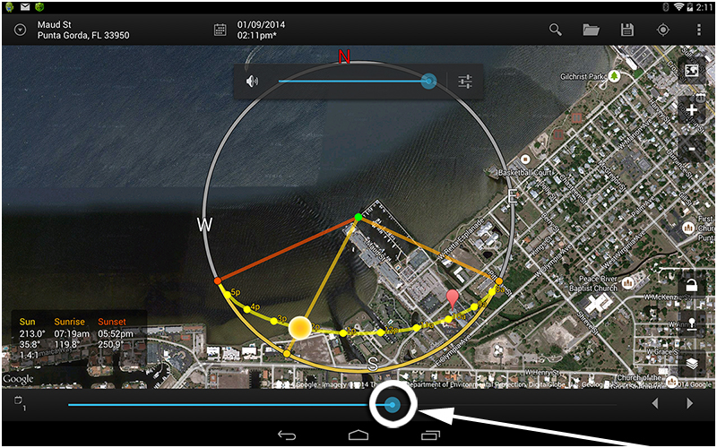 It's a Sun & Moon Position visualization and tracking displayed on a google map. Why I like this tool is if I'm shooting a pier I find that location on a satellite map watching the cross hair in the middle of the map I drag the map until it is overlaying the location you plan to shoot. Once you let your finger up there is a slider (fig 1) which I can drag to any time of day or night and see where the sun will be. This aids with sunsets, how high the sun will be during the day, shadows and much more. It can also detect whether a building will block the suns direct rays.