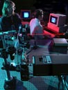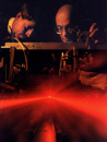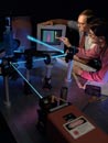 Before I begin my project I setup my strobe lights with spot grids to light only my subjects or people within the scene. I meter out the flash units so they are no brighter then f8 to f11 using ISO 100-200 speed film or digital. Second I will take an incident light meter reading of the actual laser beam. (Incident light reading is with the translucent dome over the light meter sensor) This can give you readings anywhere from one half second to three or four seconds.