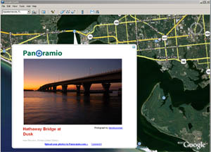 satellite mapping software http://earth.google.com/ allowing you to zoom, pan, overlay roads, parks and all sorts of other things anywhere in the world! Wow, this is cool but did you know that a plugin tool named Panoramio which allows users to add their photos as an icon position on the map as well.